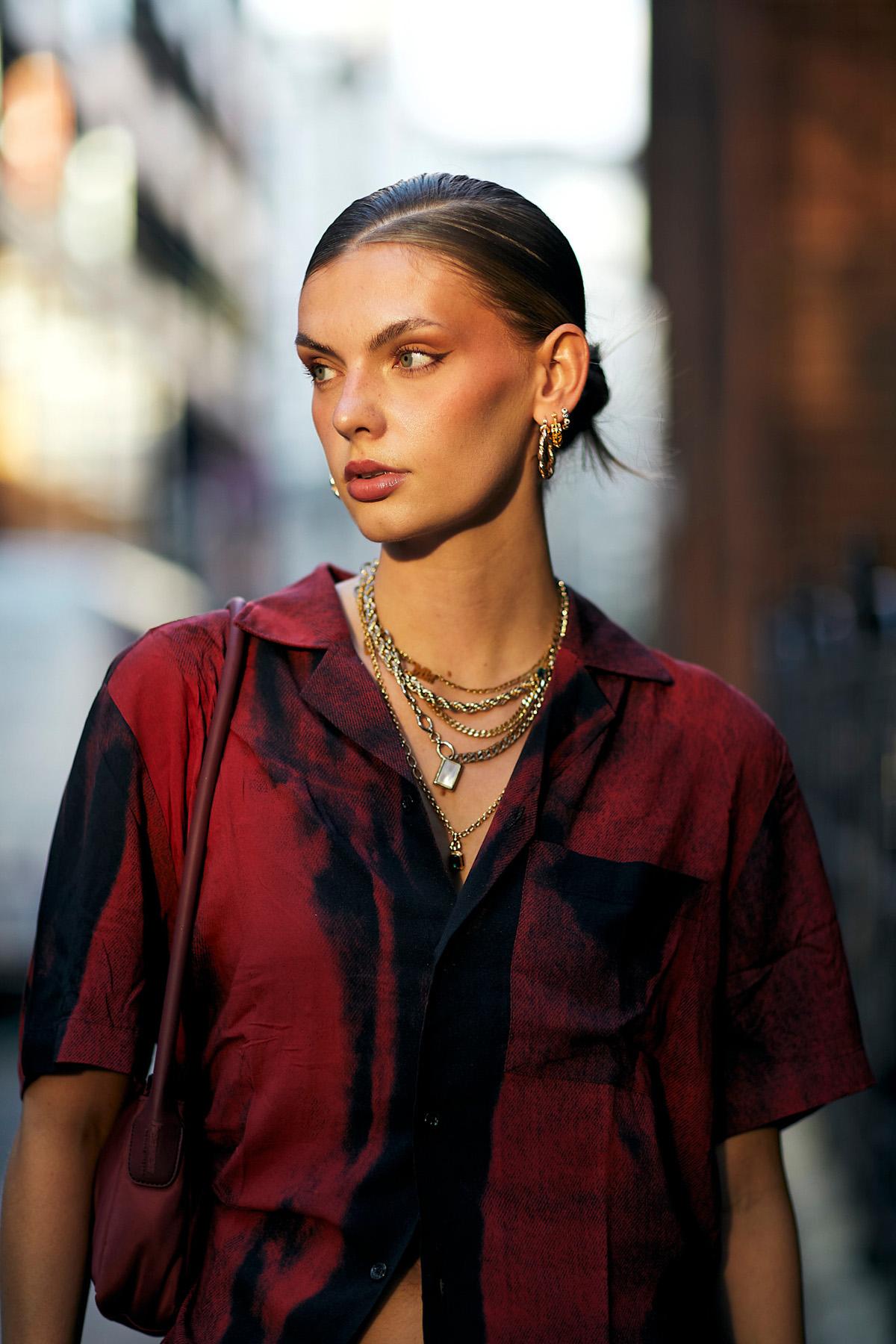 Een ordentelijke dot laag in je hals, oogt instant stijlvol. Tip: drapeer je haar in een middenmeet en trek het vervolgens langs beide kanten strak naar achteren óf doe zoals deze streetstyler en trek je ‘streep’ van het midden van je voorhoofd dwars over je kruin. Mag het nog iets meer klassieke grandeur uitdragen, ga dan voor een slick look met veel haarspray of een ander haarproduct. Gouden cuff earrings, een verleidelijke cate-eye of een extravagante zonnebril maken het plaatje compleet.