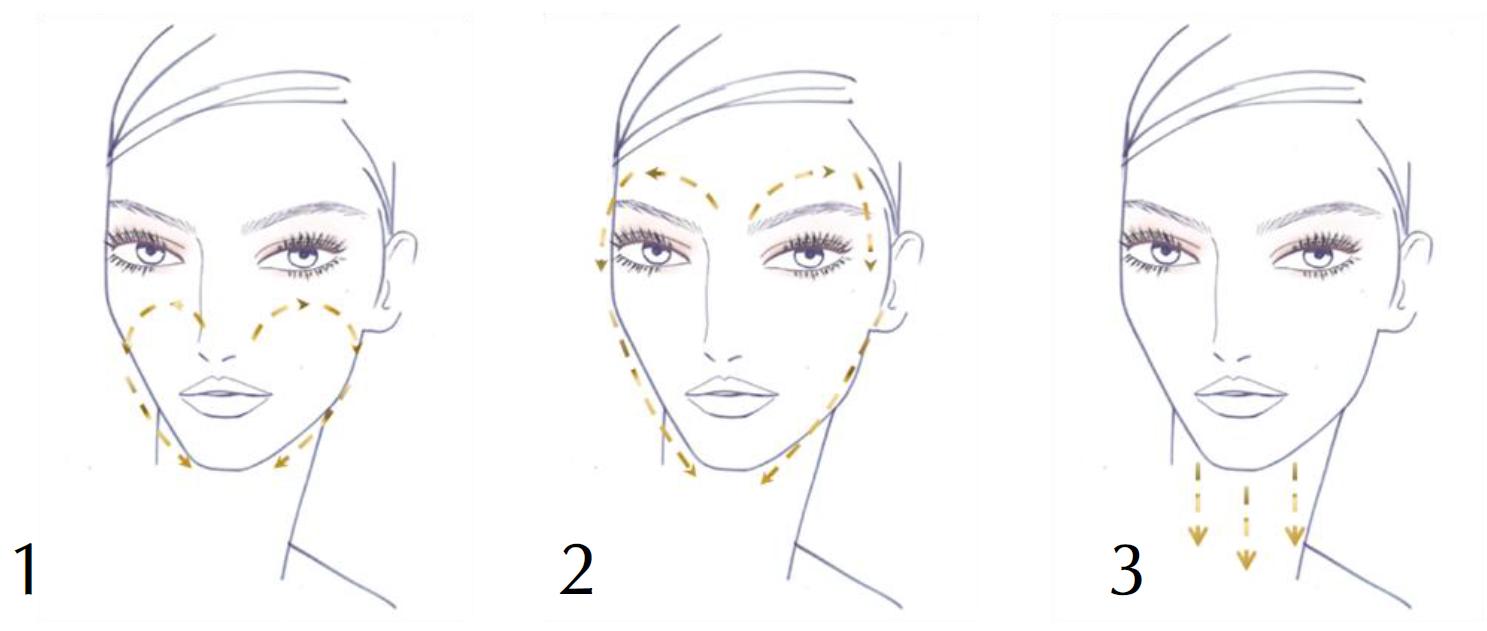 Start met het kleine hart: begin in het centrum van je gezicht en masseer naar je oren toe. Glij met je handen langs de zijkanten van je gezicht tot onder je kin om zo de hartvorm af te sluiten.