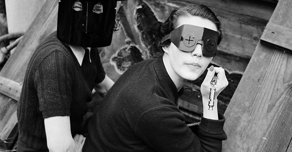 “Mijn vader was destijds ARP warden, luchtaanvalbeveiliger. Wat betekende dat hij samen met een heleboel andere hulpverleners ’s nachts op wacht moest staan voor wanneer er brandbommen vielen. Om zich daarbij te beschermen droegen ze deze zelfgemaakte, behoorlijk lompe maskers. Het beeld is van een buitengewone surrealistische kwaliteit. Die vrouwen, in elegante topjes, zittend op een krant met van die gekke maskers op. Het is een soort vastberaden viering van dat moment: we gaan hier het grappige van inzien en ons niet laten intimideren.”