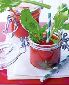 Versier met de selderijstengel en de basilicumblaadjes. Dien meteen op.