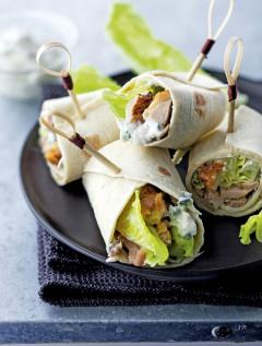 Smeer elke tortilla in met Caesarsaus. Leg enkele blaadjes sla en reepjes kip in het midden.