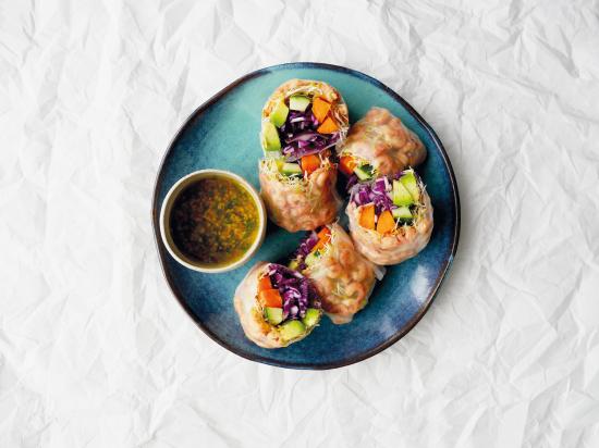 Dit is een lekker gerecht voor de lunch. Verse loempia’s gemaakt van een rijstvelletje, gevuld met rauwkost en grijze garnalen.