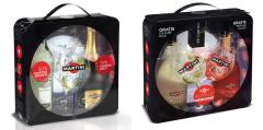 In deze elegante, zwarte boxen vind je alles voor een vrijdagse 5 o'cocktail: een fles Martini Rosato of Bianco en een fles Martini Brut met daarenboven een gratis Martini Royale cocktailglas en enkele ijsblokzakjes.