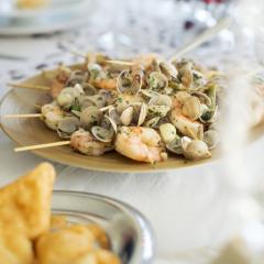 Serveer de scampi-spiesjes met de vongole en de fritti.