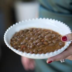 Laat de bonen minstens 7 uur weken. Giet ze af, doe ze in een pan en doe er 2 laurierblaadjes, 2 teentjes knoflook, 1 stengel selderij en 1 gepelde en in stukken gesneden ui bij. Giet er water op en kook de bonen gaar. Laat ze dan uitlekken en verwijder de laurierblaadjes.
