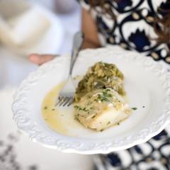 Week de vis twee dagen in water en ververs het water twee keer per dag. Doe de vis dan in een pan met anti-kleeflaag, samen met de olijfolie, peterselie, de gehakte knoflook, de pilipili en de witte wijn. Laat dit 30 min. sudderen.