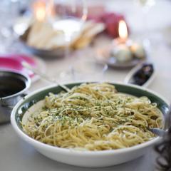 • 1 kg linguine van De Cecco • 500 g gezouten ansjovis • 6 teentjes knoflook • 1 hand peterselie • 1 rood pepertje • 1 glas droge witte wijn • 1/4 glas olijfolie