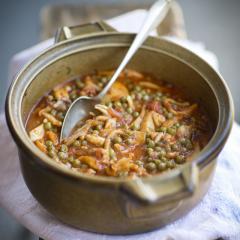 Snijd de inktvis in reepjes en doe ze bij het mengsel. Laat alles 20 min. koken. Voeg dan de tomaten of de passata toe en laat alles nog 20 min. koken. Doe de erwtjes erbij en laat opnieuw 20 min. koken. Kruid met peper en zout. Serveer het gerecht, bestrooid met de rest van de peterselie.