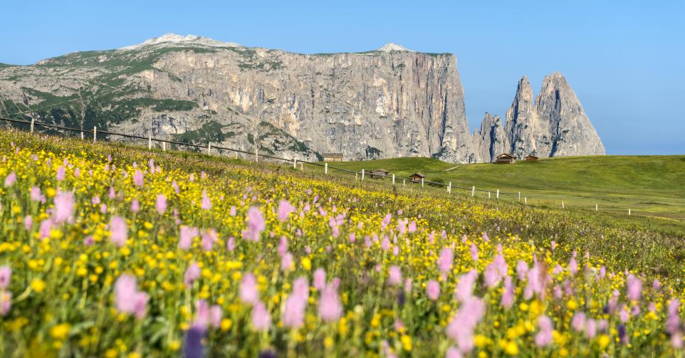 Verspreid over een oppervlakte van 56 vierkante kilometer ligt hier het meest uitgestrekte bergplateau in Europa. Het laagste punt troont 1.850m boven de zeespiegel uit, het hoogste punt ligt op 2.350m. In de winter slalom je hier dat het een lieve lust is, maar zodra de sneeuw begint te verdwijnen, ontpopt de streek zich tot een prachtig wandelparadijs. Er is 450km aan wandelpaden beschikbaar voor elk niveau. En waar je ook bent: het uitzicht over de Dolomieten is altijd adembenemend. De Sciliar/Schlern en de Catinaccio/Rosengarten zijn wat dat betreft toppers in elke zin van het woord.