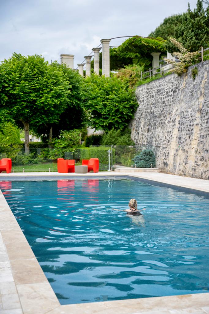 Tijd om wat verkoeling op te zoeken. Het volgende kasteel op onze route, weer een halfuurtje verder, is meteen ons onderkomen voor de volgende dagen. Château de Rochecotte ligt statig in een park en tot ons grote genoegen heeft het een buitenzwembad. Dé plek om ons meteen naartoe te reppen, na het neerzetten van onze bagage in een kamer met Lodewijk XVI-zetels met blauwfluwelen zitting en baldakijnbedden. Na een heerlijke plons krijgen we in de moderne designterrasstoeltjes een lokaal aperitief aangeboden. Een lekkere schuimwijn uit de Loirestreek: bubbels van Vouvray, met fijne pareltjes en een aroma van lindebloesem.