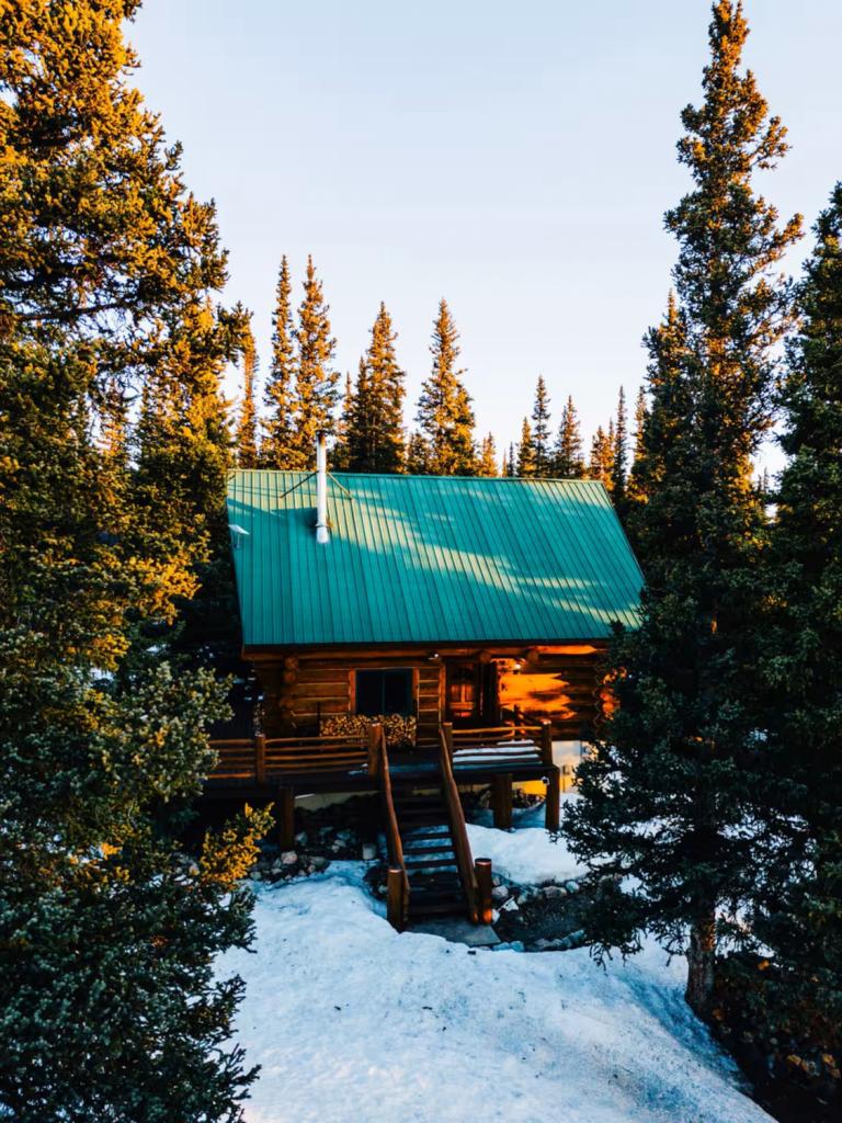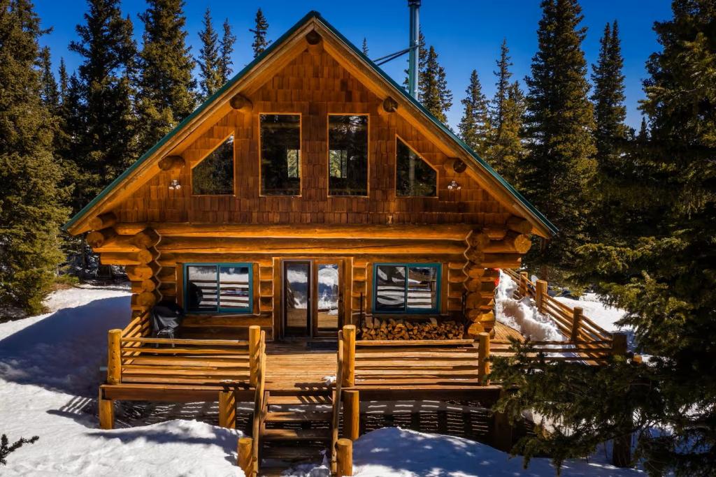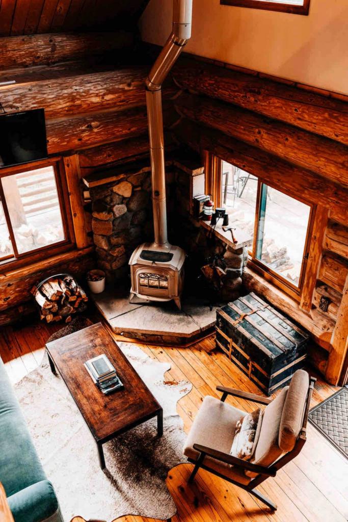 Idlewild, een houten log cabin de bossen van Fairplay in Colorado is misschien geen ultra-luxe ski-chalet, maar dat maakt een verblijf in de hut net des te authentieker. Het interieur van de houten blokhut is sober en klassiek: de hut zelf is volledig opgetrokken uit houten balken en palen. De inrichting heeft weg van die van een traditionele mountain cabin – inclusief kachel en brandhout, een dierenvel als tapijt, donkere houten kasten, een lage salontafel en ouderwetse skilatten aan de muur.