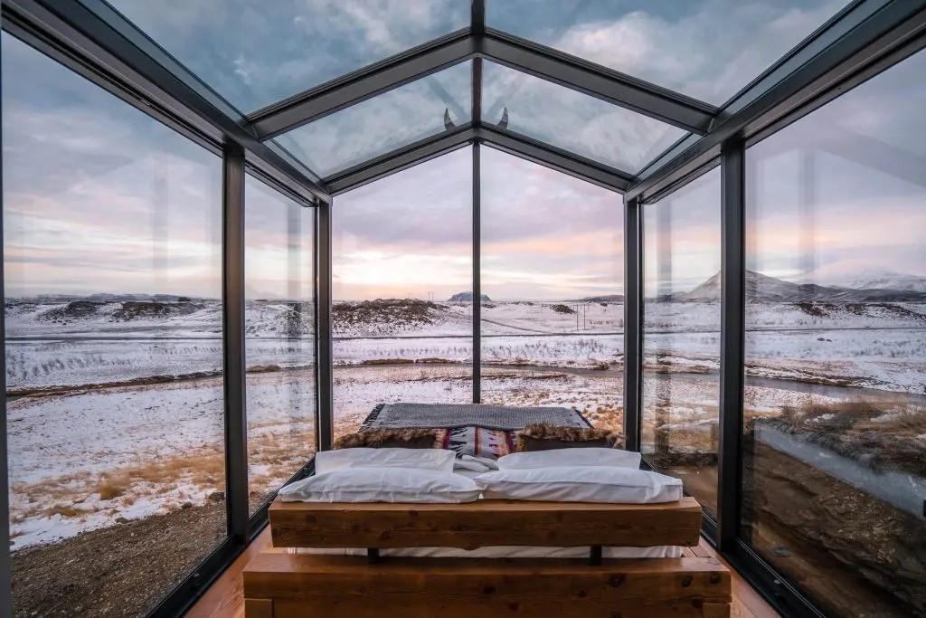 Akkoord, skiën behoort misschien niet meteen tot de mogelijkheden hier. Maar wie een verblijf boekt in een van de panoramische lodges van Panorama Glass Lodges in Zuid-IJsland zal dat vermoedelijk worst wezen. De kans dat je je vakantie liefst zoveel mogelijk binnen de vier glazen muren van je wonderlijke iglo-cabin spendeert is namelijk groot. Zoals de naam al doet vermoeden zijn de cabins van Panorama Glass lodges nagenoeg volledig opgetrokken uit glas: slapen doe je onder een glazen dak met uitzicht over de IJslandse natuur: bergen, rivieren en bij helder weer de sterrenhemel en mogelijk noorderlicht inclusief.