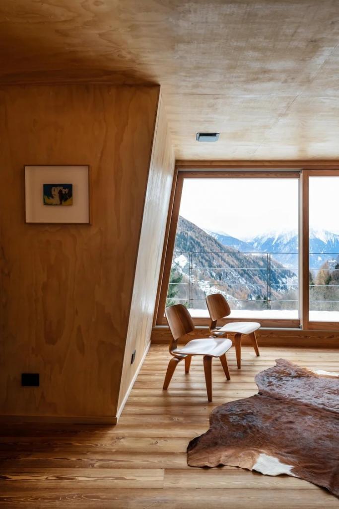 Om gasten terug in contact te brengen met de wilde schoonheid van de natuur, gooide Siffer bij de renovatiewerken niet alleen alle overbodige franjes de deur uit en liet hij het volledige binnenwerk van de cabin optrekken uit duurzaam hout. Grote, wandvullende ramen van vier op tien meter zorgen ervoor dat het landschap perfect van buiten naar binnen overvloeit. De moderne slow life-cabin is daardoor niet alleen een ideaal toevluchtsoord voor de drukke eindejaarsdagen, maar ook voor een creatieve retraites of een gezinsvakantie met een bevriend koppel.