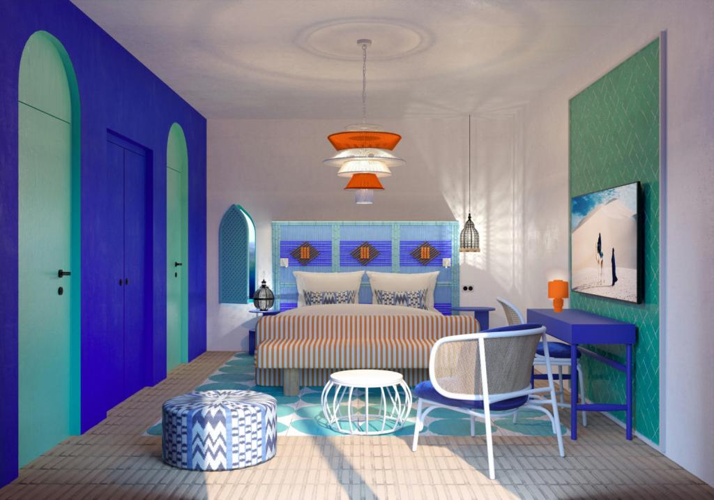 Van de keuze van het meubilair tot de schilderijen; het interieur van het resort is een mooie mix van ambachtelijke pareltjes en Berberse invloeden. Feloranje, koninklijk blauw en een diepgroen dat doet denken aan het naburige palmbos: het kleurenpalet van het complex is een betoverende ode aan Marokko. Voor deze stijlvolle omgeving zorgde interieurontwerper Laurent Maugoust, samen met heel wat lokale ambachtslui. De Parijse binnenhuisarchitect heeft niets aan het toeval overgelaten, dat is wel duidelijk. Ik laat me betoveren door de gangen versierd met oosterse kroonluchters, het tadelakt pleisterwerk en de lampjes op zonne-energie die de tuinen verlichten zodra de zon ondergaat.