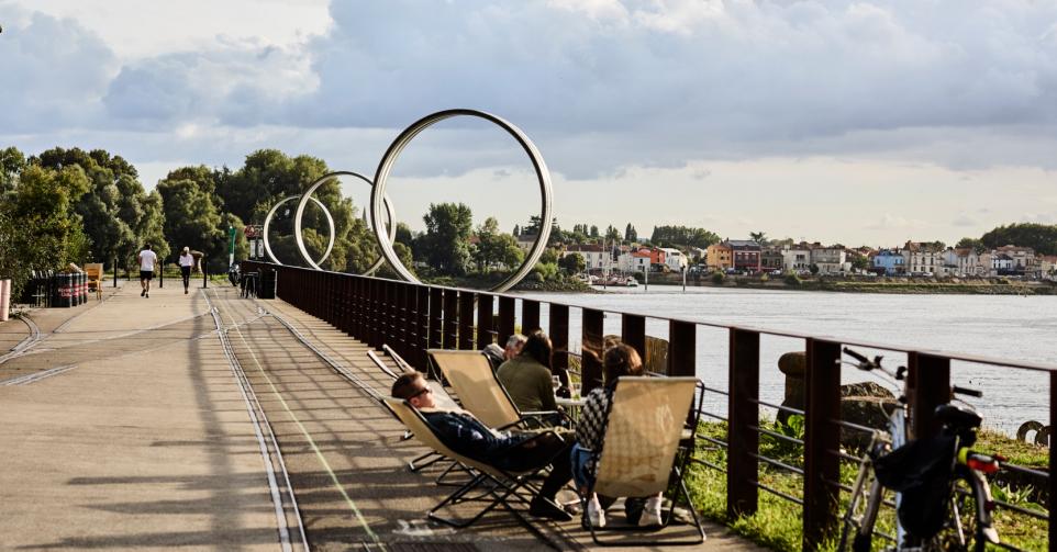 Langs het groene spoor zien we installaties zoals de reuzegrote gele lintmeter van Lilian Bourgeat en klankkunstwerk ‘Air’ van Rolf Julius; dit metalen jasje rond de handelsschool fluit in de wind. We wandelen naar het zwarte gerechtsgebouw ontworpen door Jean Nouvel, en onder een geelgeschilderde havenkraan door, over de Quai des Antilles, langs de kiosk van Jean Prouvé – zijn prototype voor een Total-benzinestation – en langs de monumentale ringen van Daniel Buren en Patrick Bouchain. Aan het uiteinde van het eiland lopen we de exporuimte HAB Galerie binnen, waar altijd boeiende wisselende expo’s hedendaagse kunst te zien zijn in de industriële, betonnen hal. Lang was Nantes de belangrijkste Franse haven, vandaar namen zoals ‘Hangar à Bananes’ waar het tropisch fruit werd opgeslagen. Voor de lokale jeugd is dit eiland nu de uitgelezen plek om uit te waaien, met streetart te experimenteren en in ligzetels van de zon te genieten, tot die in de rivier zakt en de muziek de overhand neemt in de barretjes langs het water. De ringen van Buren en Bouchain nemen ‘s nachts vele kleuren aan.
