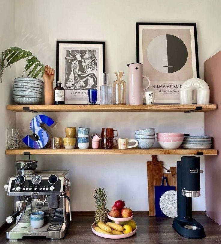 Vergeet die bar cart met je favoriete likeuren, anno 2025 investeren wij in een uitgebreide barista-hoek. Maak een plank vrij of koop een extra kastje (indien je nog plaats hebt) en etaleer jouw favoriete mokken, doe je koffiebonen in stijlvolle voorraadblikken, hang een koffiemenu uit en show het pronkstuk aka jouw koffiemachine (hierin wil je echt investeren, geloof ons).