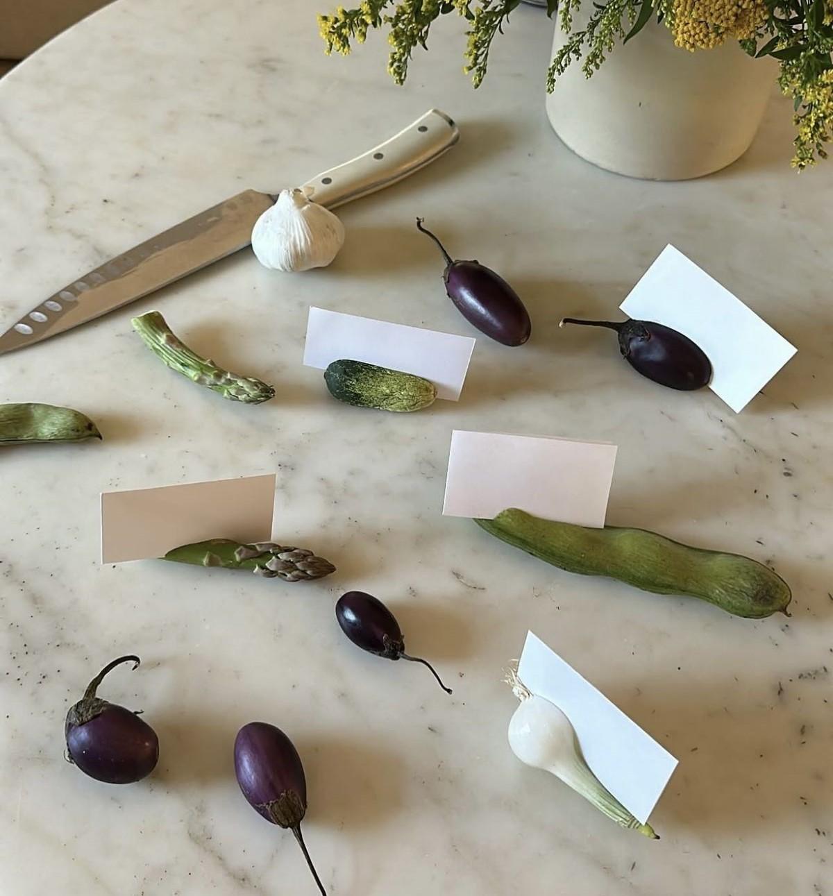 Heb je een bepaalde tafelschikking in gedachten, zorg dan voor naamkaartjes. De laatste trend op TikTok? Stukken groenten doormidden snijden en daarin een kaartje met de naam van de genodigde.