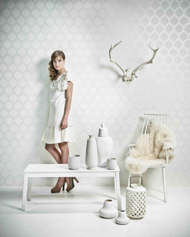 1. Een romantisch wit behang met honinggraatmotief dat zorgt voor een feeërieke sfeer in huis