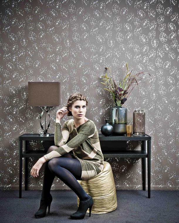 2. Een chocoladebruin behang met bladmotief dat gecombineerd met donker meubilair een luxueuse sfeer creëert.