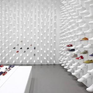 Schoenen als wandbekleding in Camper store