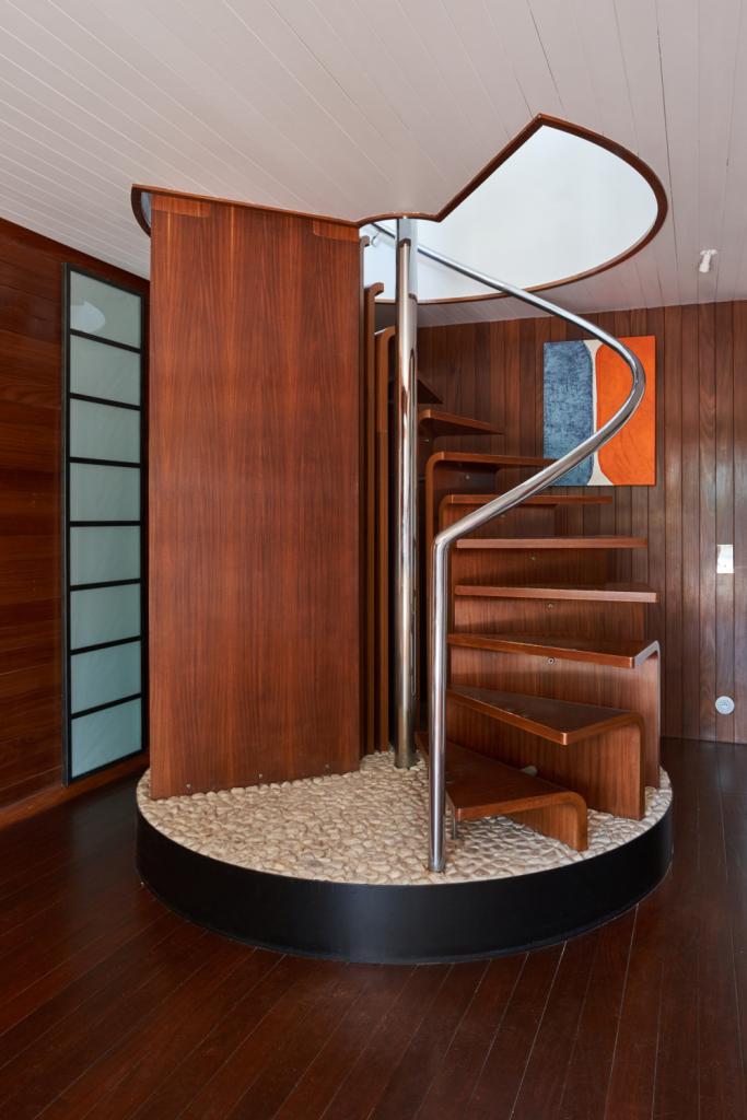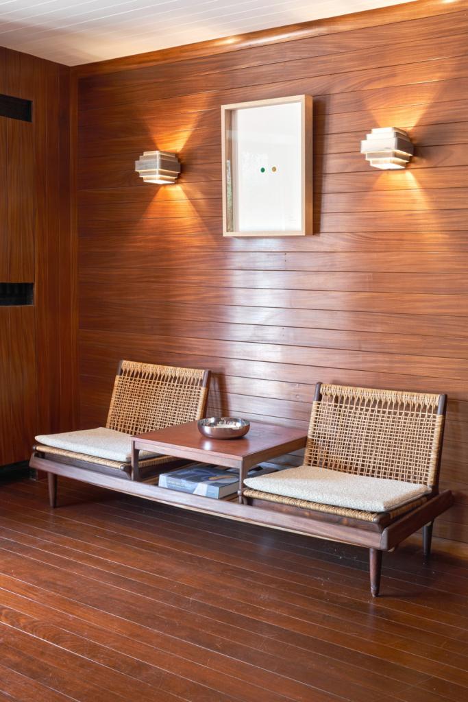 Het huis is vanbinnen gerenoveerd. De haard is nog een origineel stuk van Henry van de Velde, maar voor de rest is er best veel veranderd. Olivia: “Onze ouders en grootouders zagen erop toe dat die veranderingen altijd in lijn lagen met het oorspronkelijke ontwerp en de architectuurstijl van de woning. Zo kwam in de jaren zestig de houten inkomhal er, met de in het oog springende draaitrap die het bootgevoel van het huis nog eens versterkt. Een ontwerp van De Coene (Kortrijks meubelbedrijf waarmee bekende ontwerpers zoals Charlotte Perriand, Jean Prouvé en dus ook van de Velde mee samenwerkten, red.).” Julie: “En zo werd onlangs ook de keuken aangepakt, met Cubex-kastelementen als eyecatchers en grijsblauwe tegels die knipogen naar onze Noordzee. Voor die keuken namen onze ouders Aurélie Penneman onder de arm, een vriendin van ons die haar eigen interieurarchitectenbureau heeft. De interieurkeuzes in het huis zijn minimalistisch: natuurlijke materialen en zandkleuren zetten er de toon. Jules Wabbes-wandlampen kregen er een plek, alsook designklassiekers zoals een Poulsen-plafondarmatuur en een Saarinen-tafel met bijhorende draaistoelen.