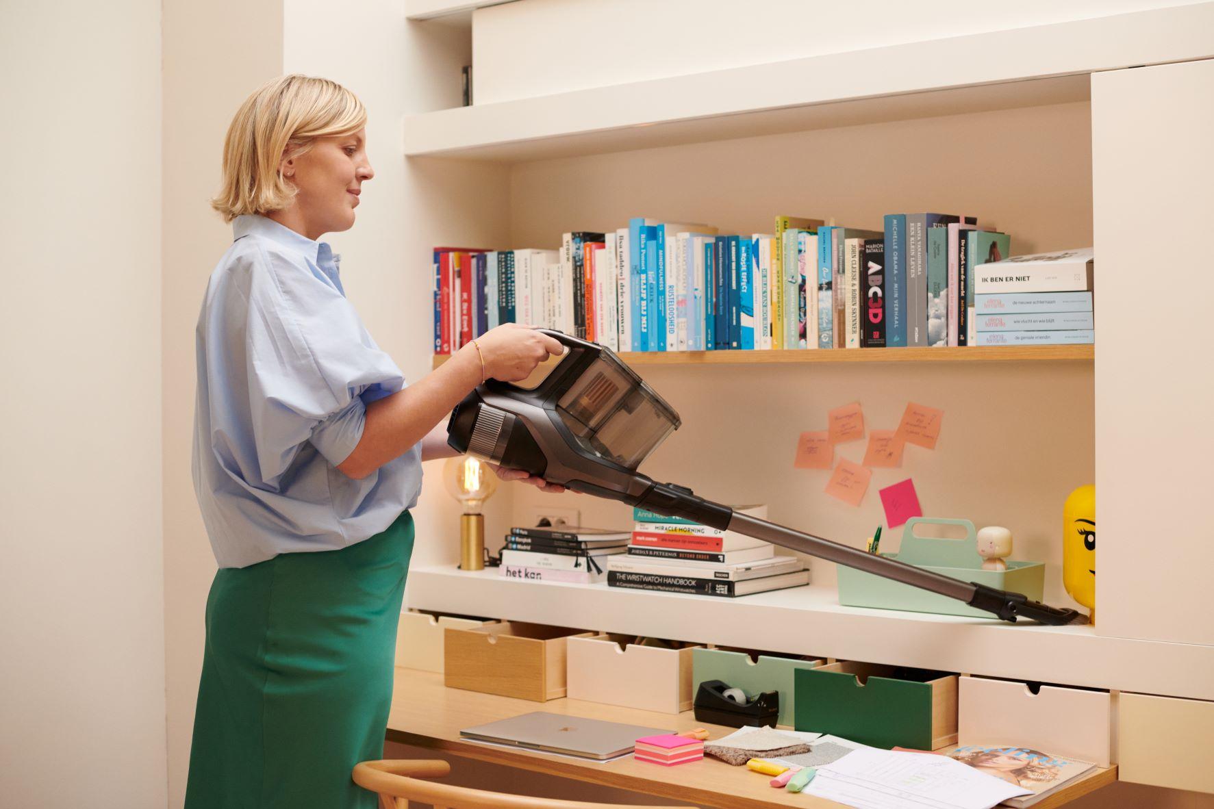 ‘Een goeie schoonmaaktool is voor mij tijdbesparend en efficiënt. Een stofzuiger en dweil in één is bijvoorbeeld superslim want je hoeft geen tijd te verspillen aan het vullen van een emmer water, je vod uitwringen… Bovendien hou ik van een toestel dat je zo van een haakje plukt en waarvoor je jezelf niet in bochten hoeft te wringen. Kortom: eentje waarvoor je absoluut niet in de ‘kuismood’ hoeft te zijn!’