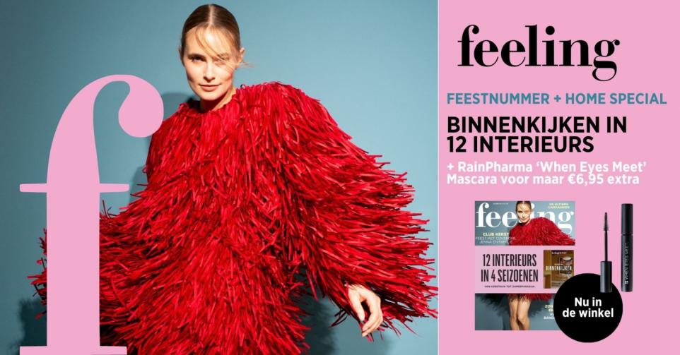 Het zijn de tradities die maken dat kerst een periode is om naar uit te kijken. Ook bij Feeling hebben we tradities. Uiteraard is er een onvervalste kerstshoot, met inspiratie voor outfit en tafelschikking. Er is een klassiek kerstmenu zonder té veel gedoe. En er is ruimte voor wie en wat ons geraakt heeft het afgelopen jaar: zoals het tv-programma Basisschool Balder. Deze editie is alles wat we jullie toewensen: tijd voor jezelf, voor elkaar, voor het ontdekken van schoonheid in het leven, met links en rechts een cadeautje om uit te pakken. Zoals de gloednieuwe Feeling Home en de ‘When Eyes Meet’-mascara van RainPharma, die deze maand voor amper € 6,95 extra bij het magazine zit.