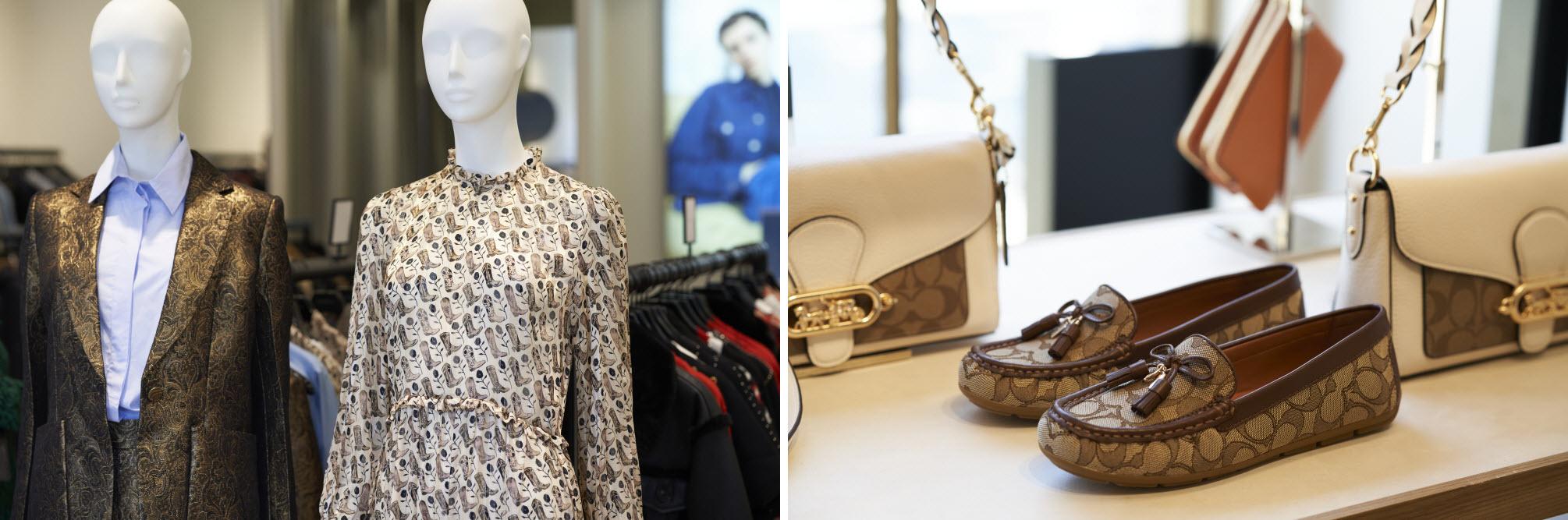 Bruine loafers met monogramprint en kwastjes – € 139 i.p.v. € 225 – Coach. Witte leren handtas met bruine monogramprint en goudkleurige sluiting met koets – € 319 i.p.v. € 495 – Coach.