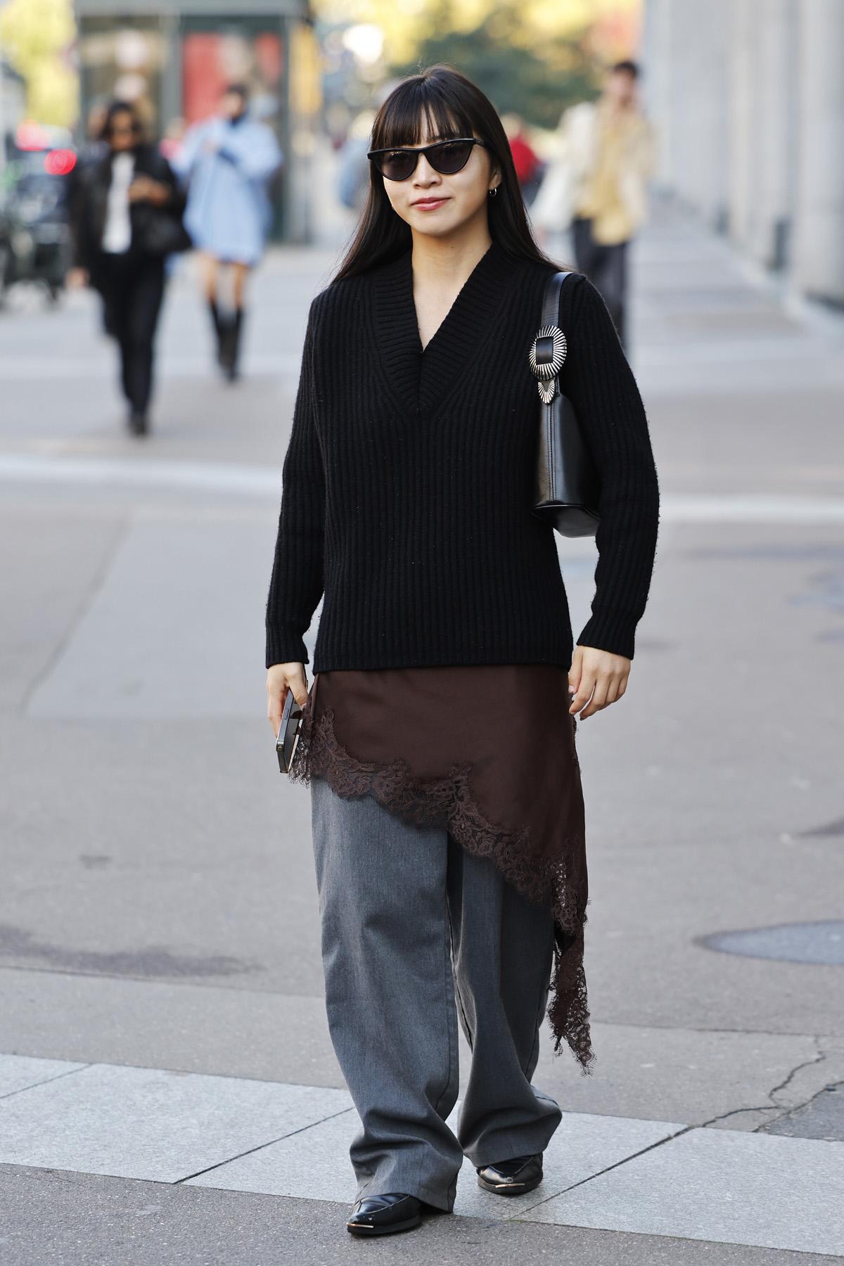 Ook altijd een goed idee: een zakelijke deux-pièce die het toch een beetje frivool houdt door een oversized blazer in old-school tweed niet te combineren met een high waisted trousers, maar met een plooirokje uit exact dezelfde donkerbruine tweed stof. Afwerken met zwarte kniehoge laarzen zorgt voor een streepje ‘office siren’.