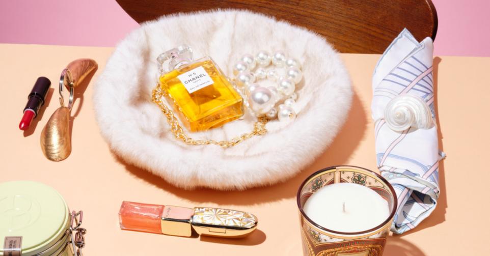 Openingsbeeld: Lipstick ‘MACximal Silky Matte’ (M.a.c, € 27). Sleutelhanger in mosselvorm (Wouters & Hendrix, € 180). Vintage bontmuts (Vestiaire Collective, € 289). Set parelarmbanden (Essentiel Antwerp, € 95). Eau de parfum ‘N°5’ (Chanel, € 168 voor 100 ml). Zijden foulard (Hermès, € 530). Ketting met schelp (Iriss bij Ruimte, € 80). Blik ‘Sea Salted Toffee’ (Cartwright & Butler, € 14,95). Lipolie ‘Kisskiss Bee Glow Oil’ (Guerlain, € 44). Lipstickcase (Guerlain, € 38). Geurkaars ‘Marrakech’ (Baobab, € 52). Ronde puzzel (Dille & Kamille, € 13,95). Kraagje met stras (Essentiel Antwerp, € 95). Punnikklos in paddenstoelvorm (Dille & Kamille, € 4,95). Bag charm met croissant (Mae bij Veritas, € 9,99). paars horloge (Swatch, € 70). © Burp Photography