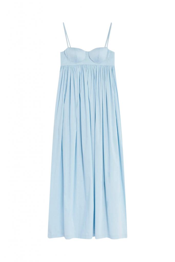 Sexy dankzij het decolleté, maar lieflijk dankzij de pastelblauwe kleur en de wijde rok. Mix met stoere extra’s – zoals zwart, of een stevige sandaal. En probeer er ook eens een witte marcel onder te dragen: dat is léúk!