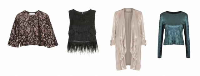 Kort jasje met pailletten (Zara, € 89,95). Topje met kralen en veren (Topshop, € 100). Metallic trenchcoat (River Island, € 30). Groen metallic topje (Dorothy Perkins, € 22).Zwarte rechte broek (Vero Moda, € 39,95).