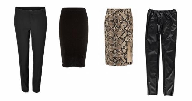 Zwarte fluwelen body-con rok met glitters (New Look, € 22,99). Kokerrok in slangenprint (Altuzarra for Target, € 42). Nepleren legging (Essentiel, € 115).