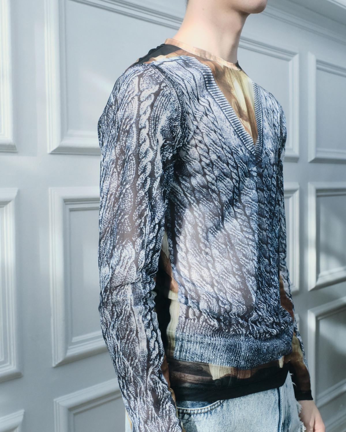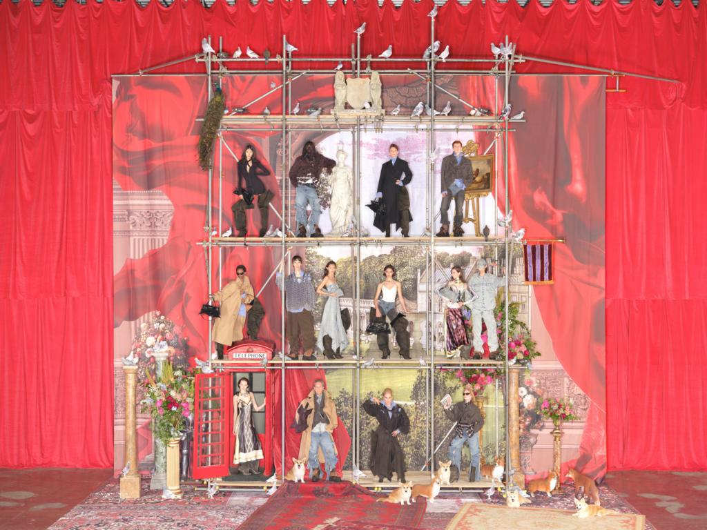 De collectie bevat onder meer een trenchcoat, flanellen en geruite hemden, jeansbroeken, een kabeltrui, laarzen en een kilt. Elk klassiek item kreeg een kenmerkende Glenn Martens-twist. Met het gebruik van folie ontwierp de Belg stukken die je kunt boetseren en aanpassen aan de gelegenheid of je eigen stijl. “Elke dag speel je meerdere rollen,” zegt hij, “en ik wilde één jas ontwerpen die bij al die persoonlijkheden past.”
