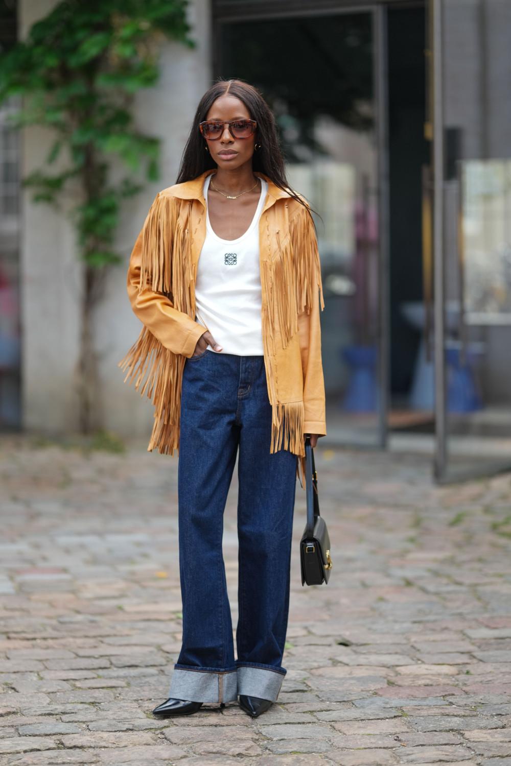 De oversized jeans met breedvallende pijpen, lage taille en broekszomen die over de grond slepen is lang de go to stijl geweest van de fashion incrowd. De broek is intussen een basic geworden, dus moet je niet meteen op de ‘weggeef’-stapel gooien. Al dragen we de brede broek dit najaar een tikje anders, met een omgeslagen zoom. Gezien op en naast de catwalks en vooral een grote hit in donkere wassingen.
