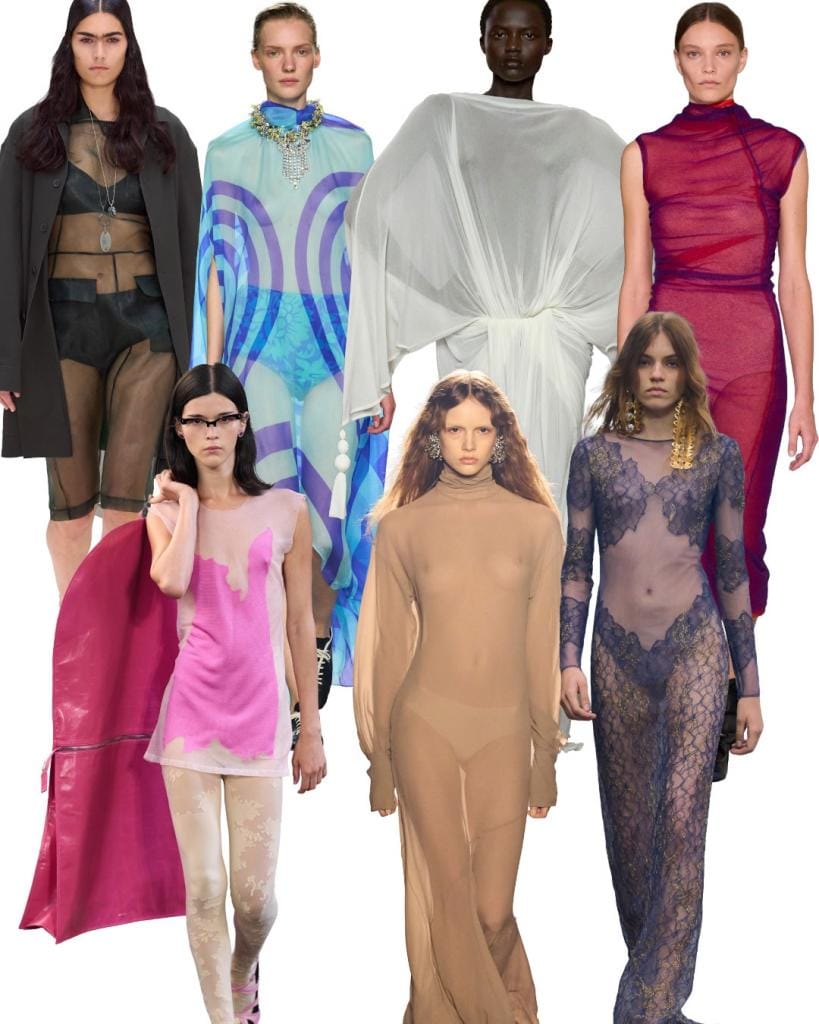 Transparante laagjes zijn een vaste bouwsteen van onze garderobe geworden: onder of over een niet-doorschijnend stuk zorgen ze voor meer dimensie in een look en voegen ze, mits weloverwogen toegepast, een vleugje mysterie toe. Een ‘naked dress’ voor de feestdagen is gedurfd, maar kan minder intimiderend aanvoelen in combinatie met een opvallende panty, een shaping body of een gezellige trui.