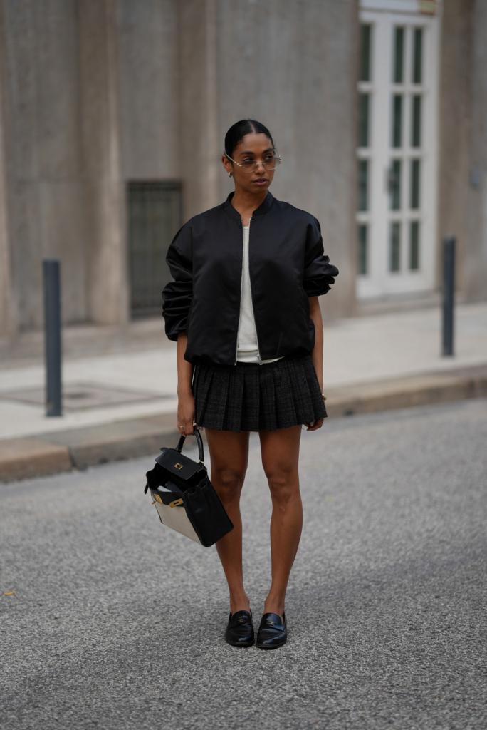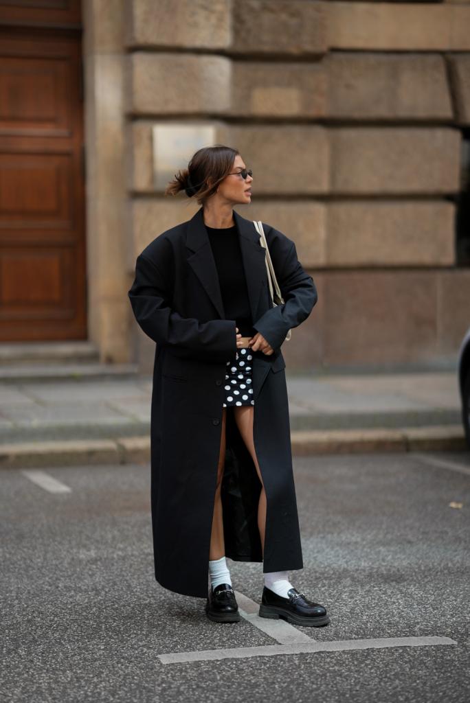 Opvallend vaak gespot deze herfst: klassieke loafers met zwarte panty’s en een korte jurk. Die laatste kan donkerblauw, grijs of zwart voor een vintage preppy look. Of in cognackleurige faux-leer voor een Italiaanse quiet luxury-look. Een mantel of blazer met nepnerts maakt het plaatje compleet.