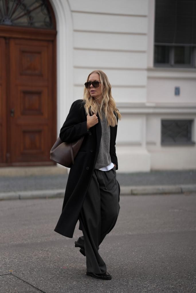Ook onder een baggy tweed kostuumbroek staan loafers perfect. Wil je een nonchalant Copencore cool silhouet creëren dan werk je best met meerdere losvallende laagjes. Draag over je soepel vallende wollen broek een oversized wit of zwart T-shirt, een kwaliteitsvol gebreide grijze, donkerblauwe of zwarte trui en een ruim vallende mantel tot aan je enkels.