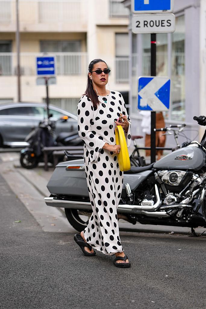 Nog een essential – als je het ons vraagt – de polkadot-jurk. Ga in volledige Minnie Mouse modus en combineer girly met een strik in het haar en een paar klassieke slingbacks. Voor een stoerdere look voeg je chunky platformslippers toe en een slouchy handtas.