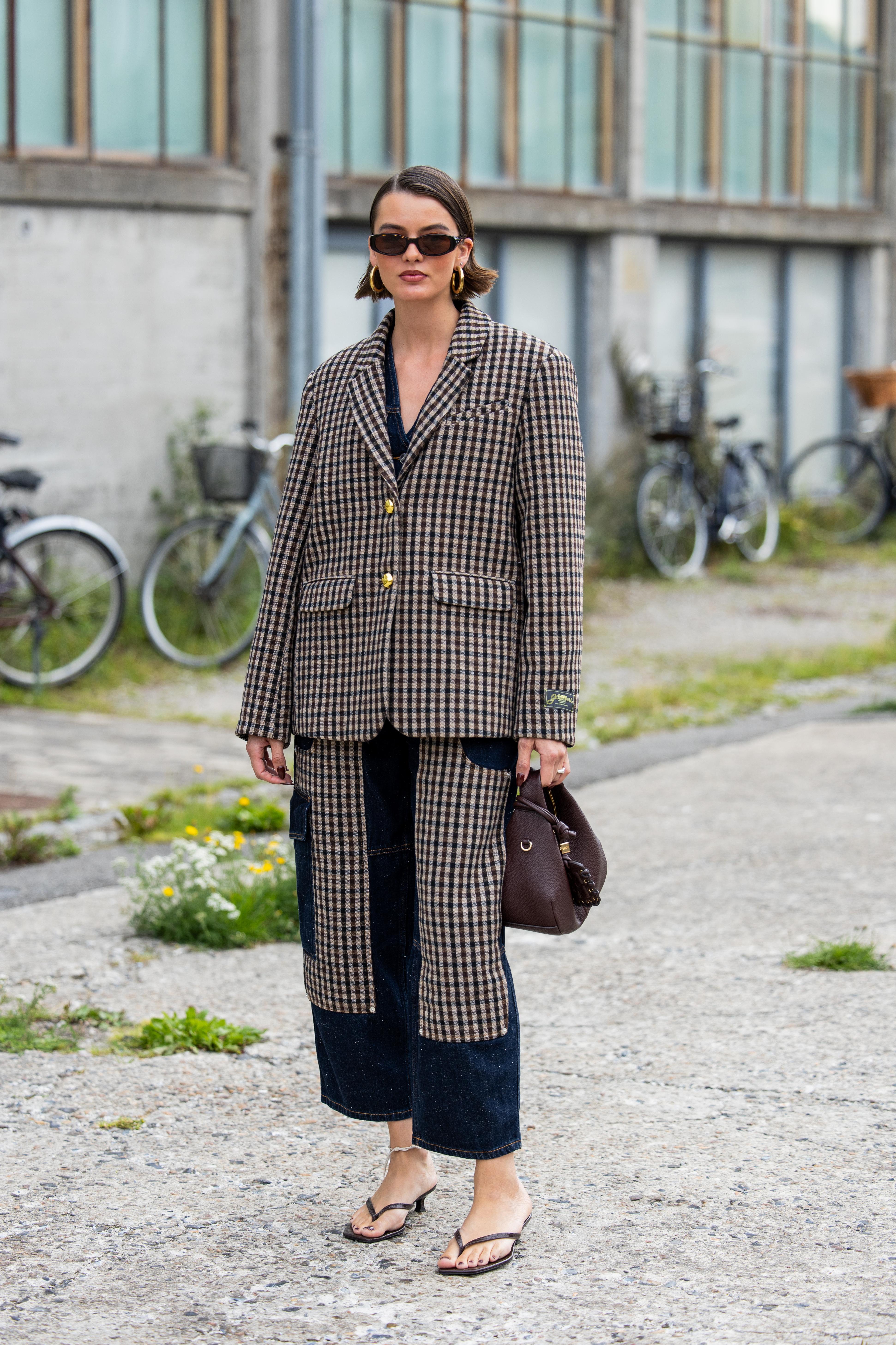 Ook helemaal office proof, maar iets meer retro: een eclectische look met donkere denim en ruitjes. Ook hier past een paar flip flops perfect. Een smalle nineties zonnebril en gouden oorringen zorgen voor een retro cool.