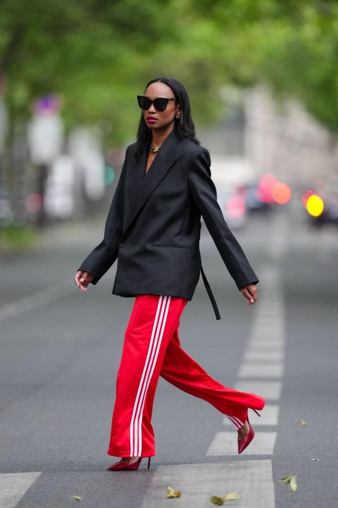 It’s giving Carrie Bradshaw én daar houden we van. Deze look speelt met contrasten en is daardoor super geslaagd. De stijlvolle blazer en stiletto’s worden gecombineerd met stoere Adidas-trackpants, waardoor de outfit tegelijk casual en toch ook classy is. Take notes!