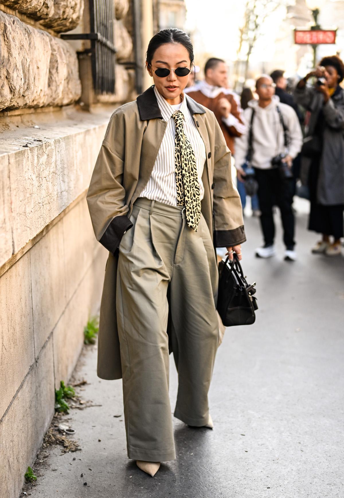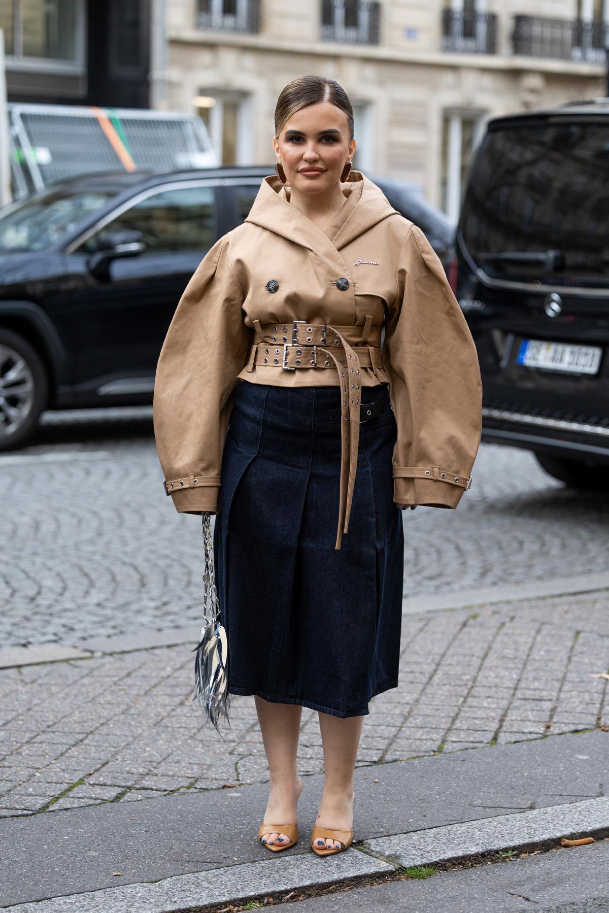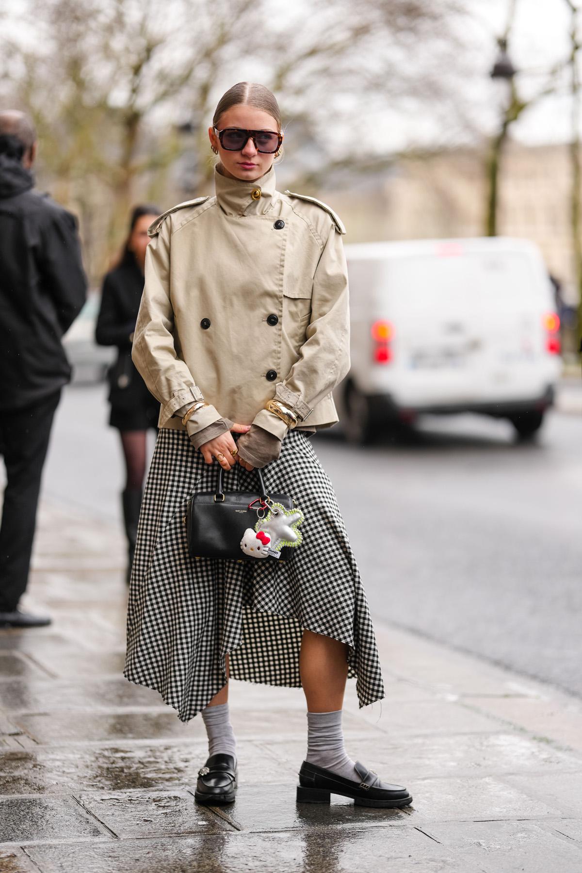 De korte trenchcoat maakte vorig jaar reeds furore, en houdt ook stand in 2025. Deze look met geruite midi rok en loafers vindt het midden tussen elegantie en stoerheid.