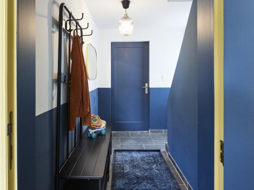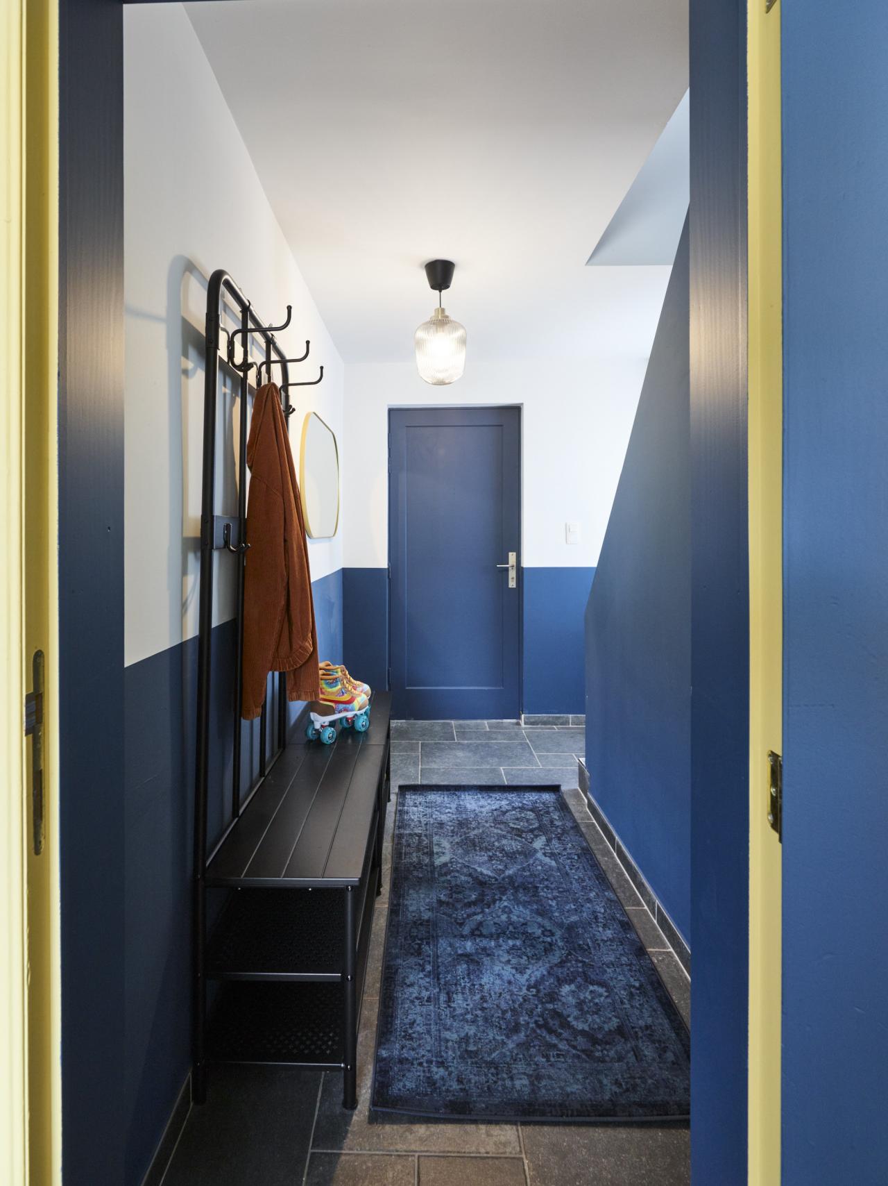 De doorbraak van een muur tussen keuken en woonkamer versterkt de verbinding en de gouden en blauwe accenten in de inkomhal voegen ook hier een theatrale sfeer toe. De ruimte is geoptimaliseerd voor ontvangst, met een grote kapstok en een bankje voor schoenen. Okergele en bruine tinten versterken het retro gevoel.