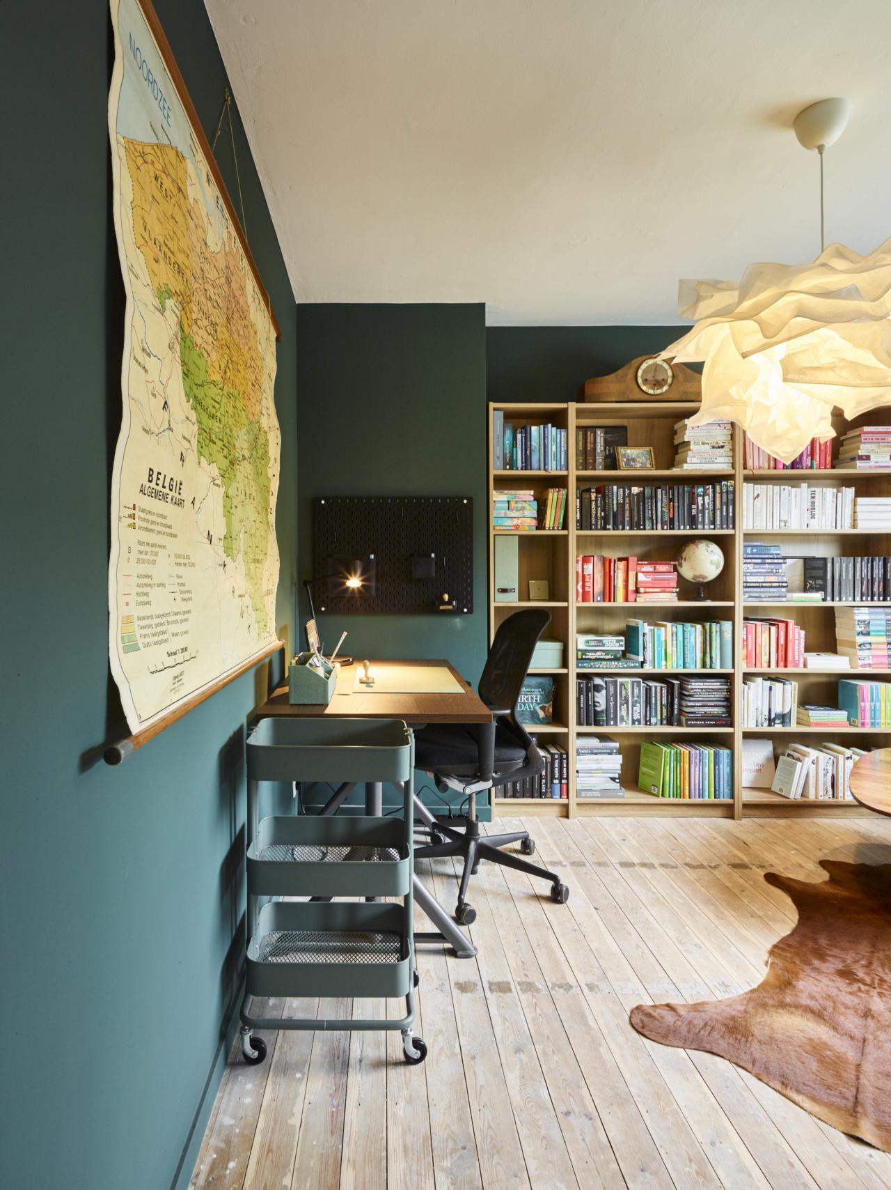 Christophe wist met behulp van de juiste meubels, een droomwoning voor Seppe en Niels te creëren: ‘Met een toevoeging van geel/beige gordijnen, planten, boeken en diverse decoratie, wordt het geheel supergezellig. De gekozen kleuren komen ook terug in het tapijt en in de zitruimte. Het perfecte decor voor het knarsende geluid van de platenspeler. Ik wilde hier een theatrale sfeer creëren. In de inkom heb ik daarom gekozen voor gouden accenten op de blauwe muur en bijpassende verlichting.’