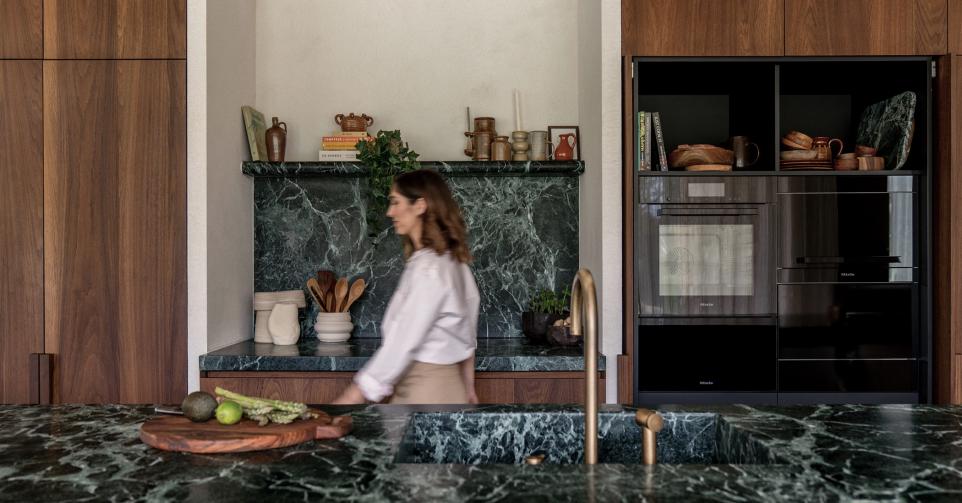 Gerookte eik, groene marmer en toptoestellen van Miele: daarvoor kozen zelfstandig onderneemster en actrice Kim Van Oncen en haar partner Niels toen ze hun keuken bouwden. Het resultaat is niet alleen prachtig om te zien, maar maakt hun drukke leven ook een pak makkelijker.